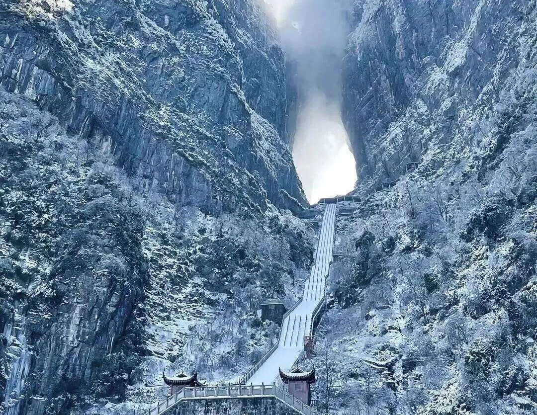 - Zhangjiajie’s Tianmen Mountain: Covered in snow, known as the “Stairway to Heaven.”